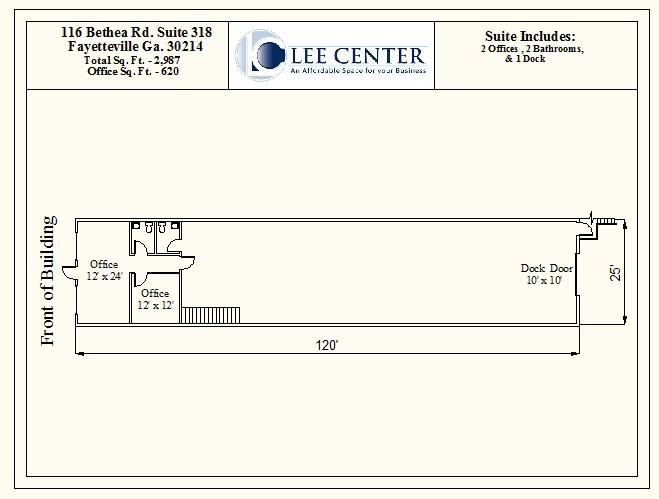 116 Bethea Road Suite 318 features 2,987 square foot warehouse space with two offices (620 square feet), two restrooms, and one dock high door, and large truck court. The lease rate is $2850 per month and includes the water, sewer, common area maintenance, and taxes and insurance on the building. Please call our leasing office for additional information 770-461-3817