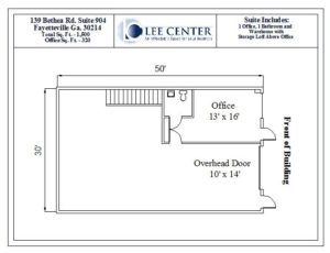 139 Bethea Road Suite 904 in Fayetteville, Ga features a 1,500 Sq. Ft Warehouse w/ 1 office (320 Sq. Ft.), 1 restroom, warehouse area with 1-12′ x 14′ drive-in door. The Lease Rate is $1500 per month and includes the taxes and insurance. The tenant is responsible for their electric, gas, and garbage. Please call our leasing office to schedule a showing – 770-461-3817